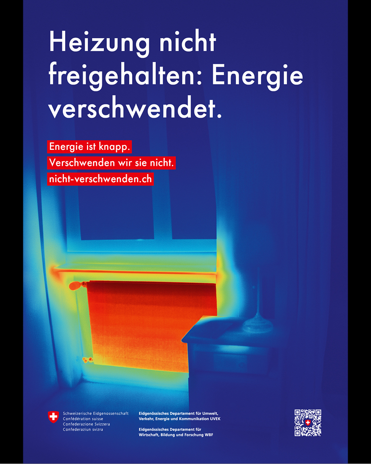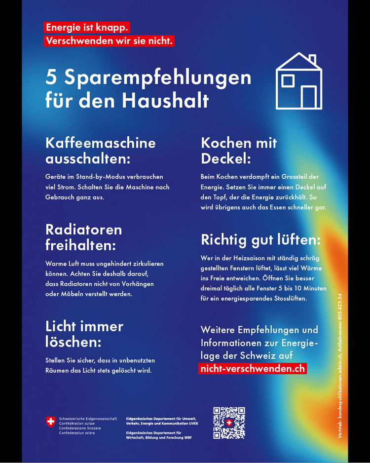 Die im Auftrag von EnergieSchweiz lancierte Kampagne reagiert auf die angespannte Versorgungslage, gibt Energiespar-Empfehlungen und bündelt diese auf dem Online-Hub nicht-verschwenden.ch, der auch über die aktuelle Lage der nationalen Energieversorgung informiert.